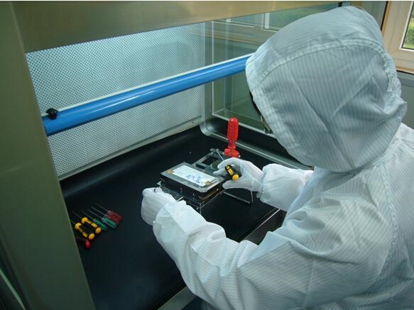 首先,硬盘开盘需要在无尘环境下进行,需要配备专门的无尘室或者无尘工作台,并且级别越低越好,越低代表空间内的灰尘越少,因此这个环境成本就是几万到上百万不等。